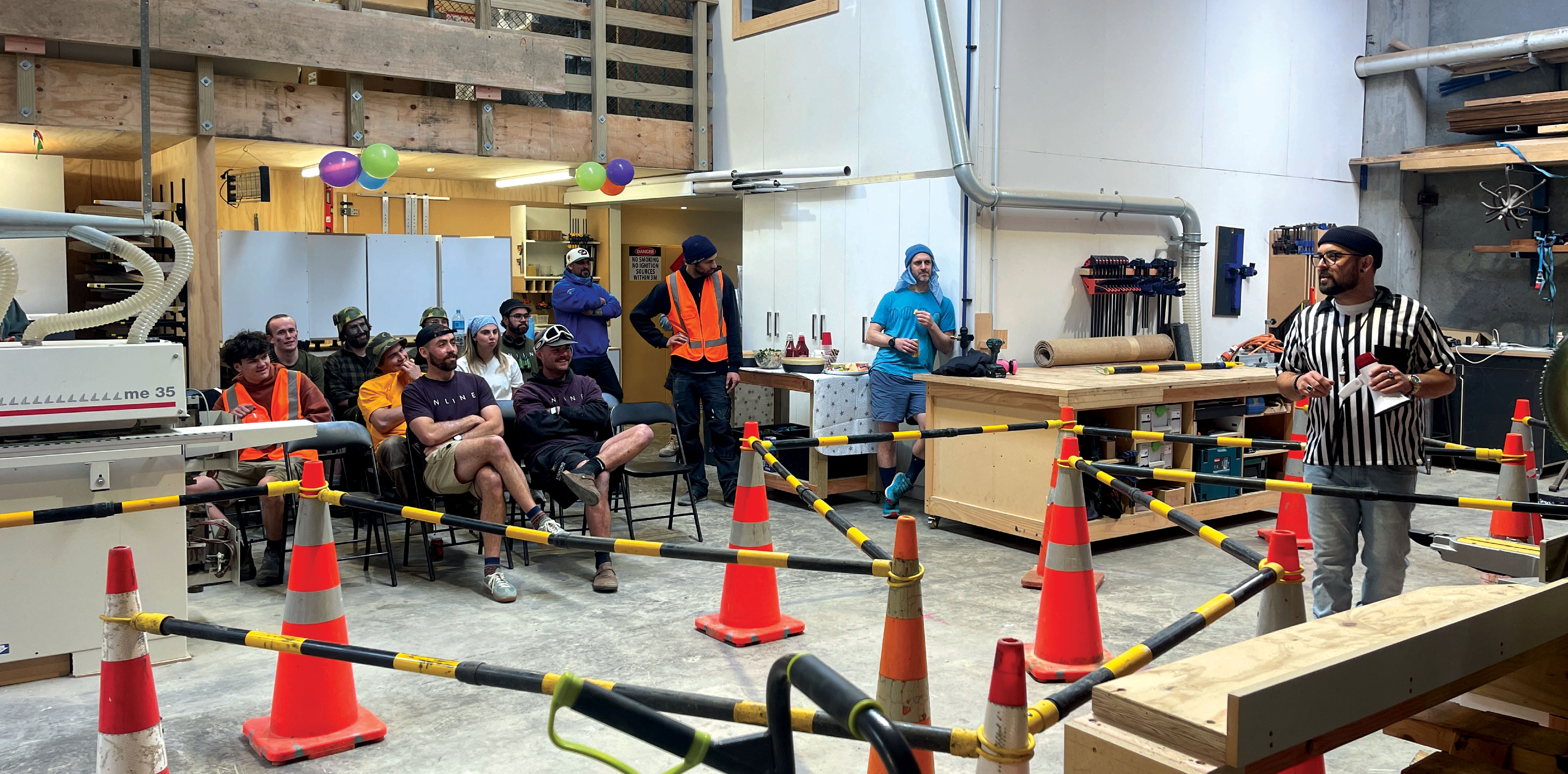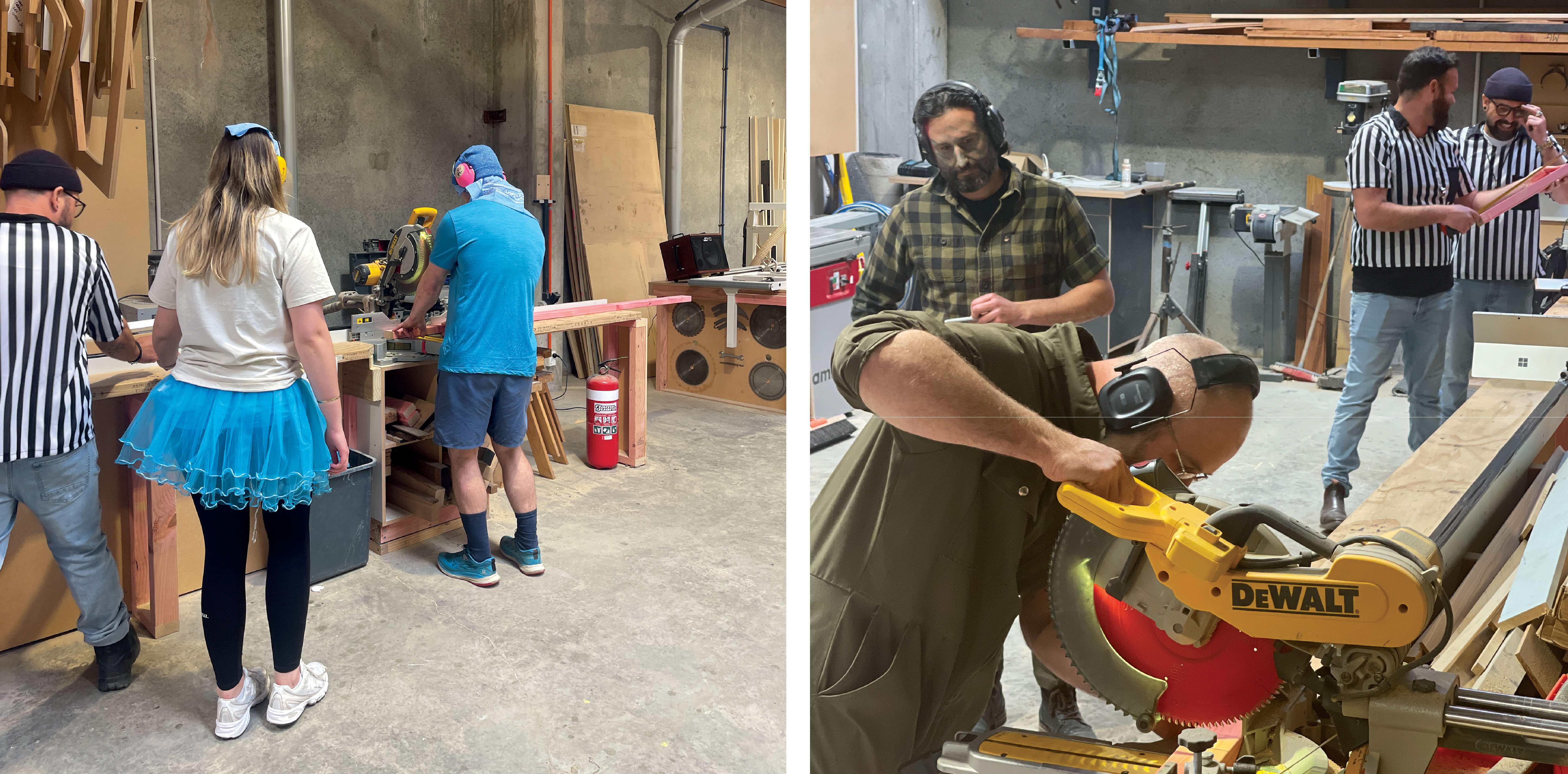 The Challenge: Using a single length of timber, participants must cut the required pieces to the nearest millimeter using intuition only - no measuring devices, pencils, or gauges allowed. Points are awarded for both accuracy and speed.